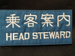 | 【腕章】 「乗客案内(水色)/HEAD STEWARD」 旭興産 製 昭和48年4月 フェルト生地 刺繍文字 縦7.5×横41p 紐付、安全ピン付、 折り目有 若干焼有 状態 優 |