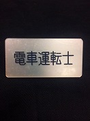 【電車運転士】 3×6×0.3p 彫文字 安全ピン・クリップ付 経年汚・擦有 安全ピン・クリップ変形有 状態良 |