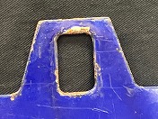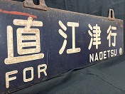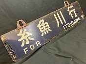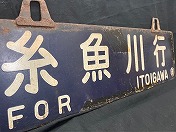 「糸魚川行○直/直江津行○直」吊ホーロー紺板白浮文字 使用によるテープ痕 ホーロー剥、端曲、錆有 耳リベット固定時代 状態使用痕共に極上 【純正品保証】(名古屋店) |