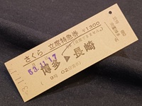 【立席特急券】 「さくら」 ¥1300 53年11月17日 博多⇒長崎 (9時02分発車) 央6⃣博多駅発行 状態 優 |