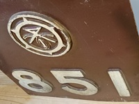 | 【車両部品】 「側車番切抜 社紋・851号車」 阪急 原板原色 鉄板:50cm四方 851号車は昭和24年に建造され当初は751号車を称した。 製造の翌年に851号車へ改番のち昭和57年廃車。 裏面梁有・塗膜状態良好/状態 優 |