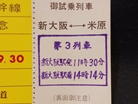 【試乗記念券】 「東海道新幹線試乗記念」 1964年9月30日 5.5×15.5㎝ 御試乗列車 新大阪⇔米原 第3列車 新大阪駅発11時30分 新大阪駅着14時14分 折目有/状態 良 |