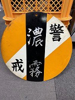 「警戒標識」 金属板製/ 緑/白色 裏面/黄/白色 塗装仕上/ 濃霧記載有 黒帯/塗装仕上 サイズ/直径38㎝ 上部に穴有 使用による若干の 錆、擦り傷等有 状態優 |