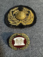 「帽章・襟章セット」 大阪市交通局 帽章 黒色フェルト生地製/ 金色刺繍仕上/ 大電マークは金属製 サイズ/4.5/5.5/1㎝ 襟章 金属製表面べっ甲仕上/ ネジ式 サイズ/2/2.3/0.8㎝ 状態優 |