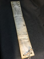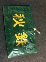 「秋鉄」 緑色布製/ 黄色印刷文字仕上 ビニール製カバー付/ サイズ/9/36㎝ 中央部上部に 安全ピン付/ 両脇に固定用穴 2つずつ有・ 紐付 両脇に マジックテープ有 状態優 |