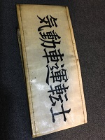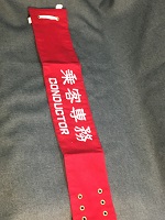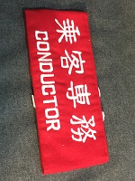 「乗客専務」 昭和61年3月 旭興産株式会社 朱色布製/ 白色印刷文字仕上 サイズ/7.5/41㎝ 左端部分に固定用穴 6つ・ 右端部分に固定用穴 2つ有 紐付 中央部上部に安全ピン 1つ有 状態優 |