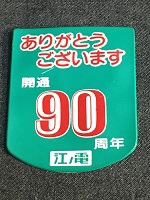 「ありがとうございます 開通90周年バッジ」 江ノ島電鉄 ビニール樹脂製/ 表面印刷文字仕上/ サイズ/4.8/5.7㎝ 裏面に安全ピン付 状態優 |