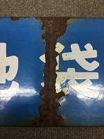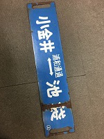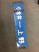 「小金井-上野〇上/ 小金井-池袋 浦和通過 〇上」 青色ホーロー板製/ 白色浮文字仕上 両脇に手掛け穴 1個づつ有塗料剥げ・ 表面に処分時に付いた 車挽き痕有 使用による汚れ・ 錆等有 状態良 |